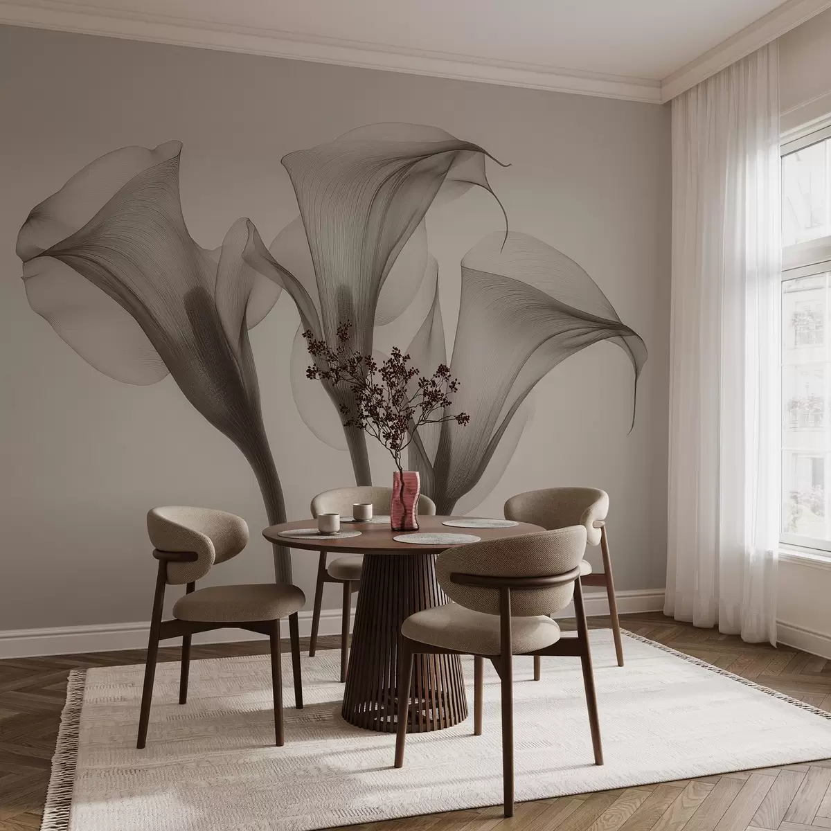 Fotobehang luchtige transparante Zantedeschia bloemen in beige tinten N° w02632