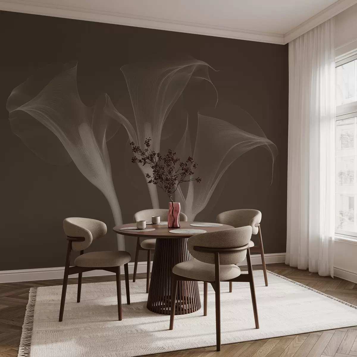 Fotobehang luchtige transparante Zantedeschia bloemen op een donkere achtergrond N° w02632v1