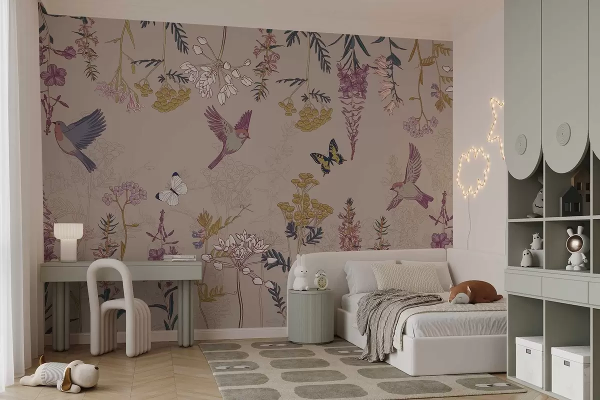 Fotobehang een ensemble van wilde bloemen en vogels op een beige achtergrond N° w02634