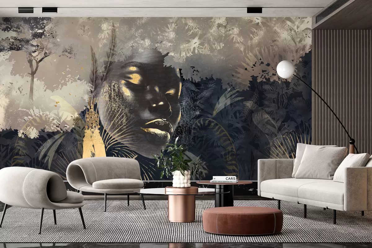Fotobehang Magisch Afrika met regenwoud, meisjesachtig en vectorelementen met blauwe tint N° w02642v1