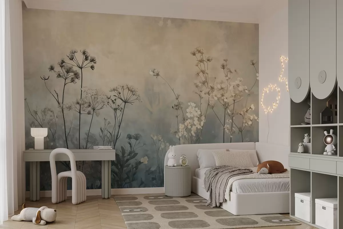 Fotobehang behang in eco-stijl met wilde bloemen en planten op een achtergrond met structuur N° w02685