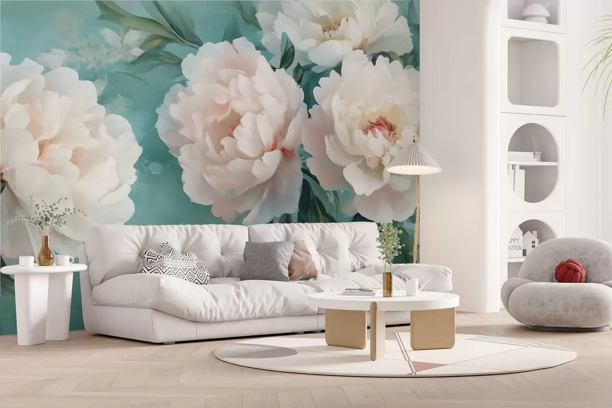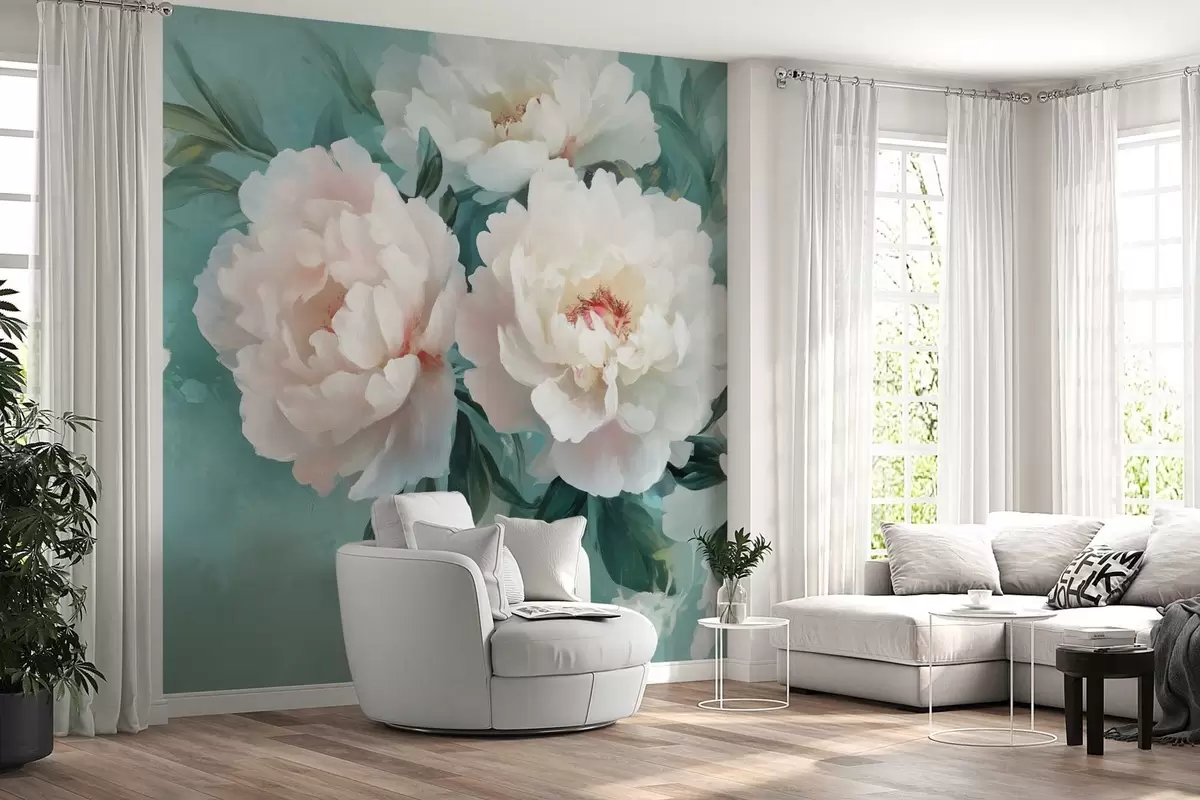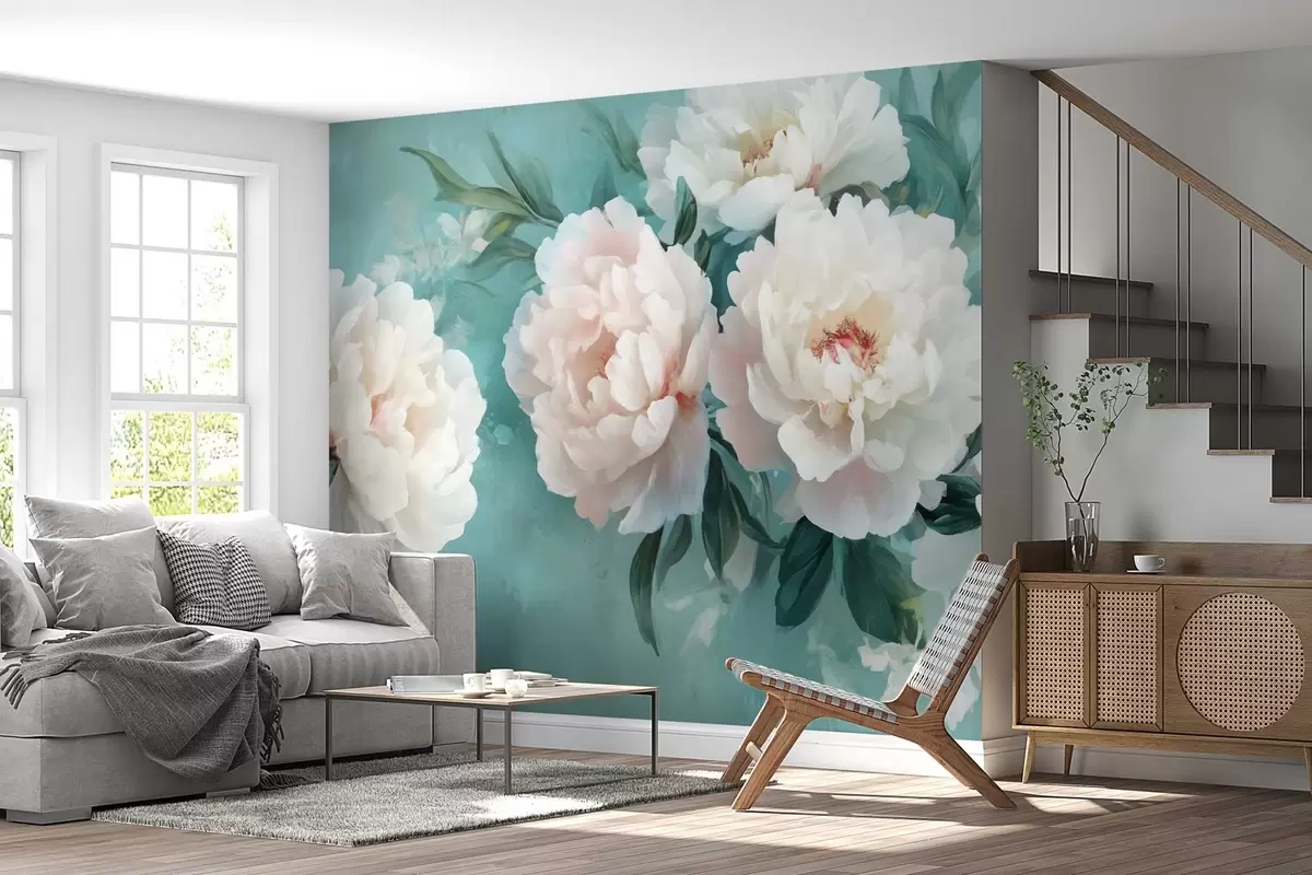 Fotobehang grote bloemen van weelderige pioenrozen op een turquoise achtergrond N° w02763