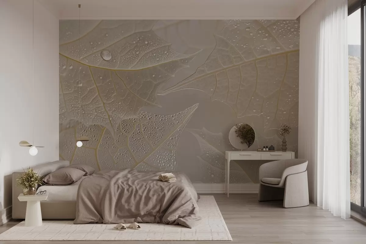 Fotobehang Close-up van bladeren met nerven en dauwdruppels in beige tinten N° w02872