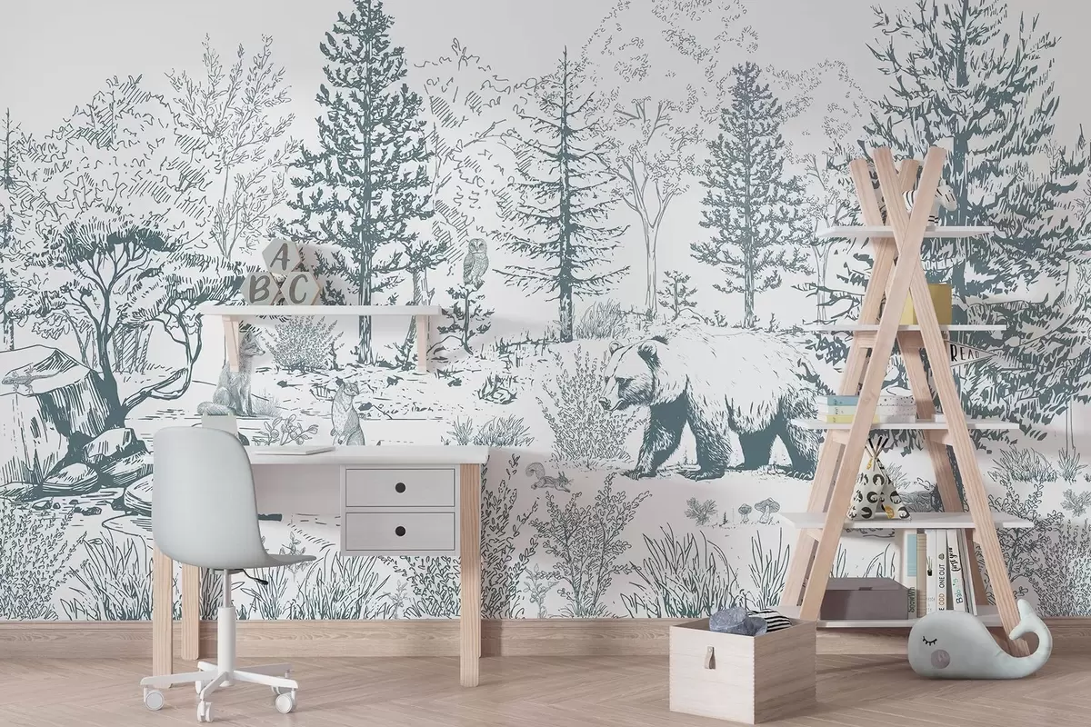 Fotobehang Bosleven, bomen, wilde dieren, beer, vos, uil, struiken, potloodtekening, blauwe kleuren N° w02929v1