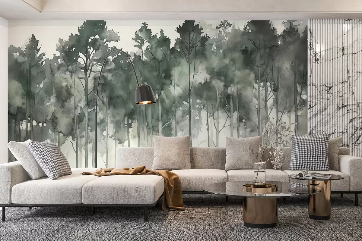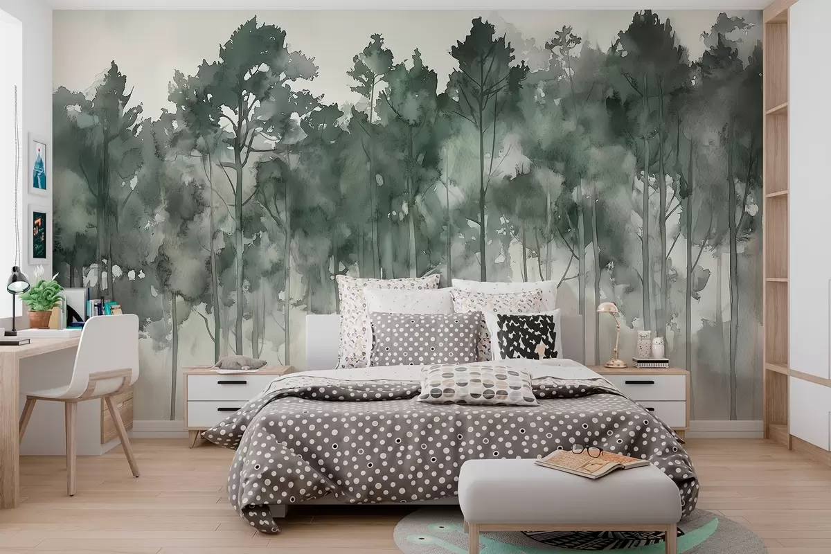 Fotobehang Bos in aquarelstijl, dennenbomen, natuurlandschap, groene kleuren N° w02937