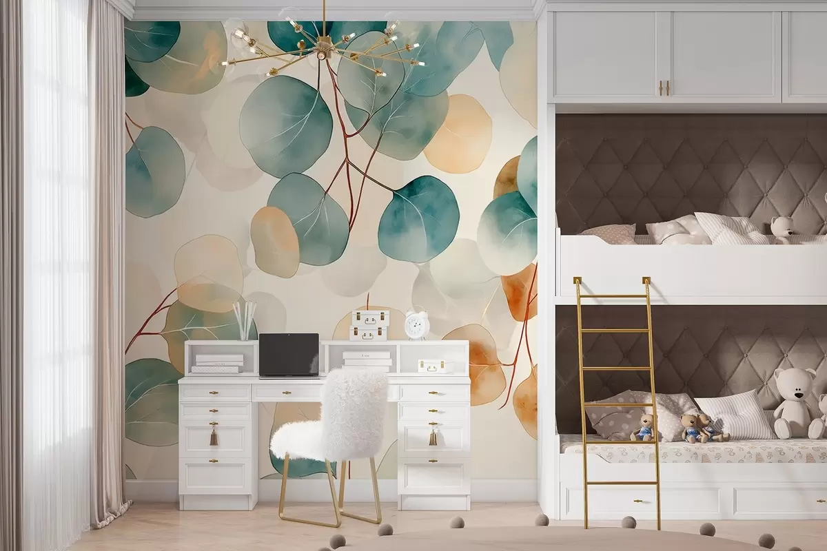 Fotobehang Eucalyptustekening in aquarelstijl, zachte pastelkleuren, bloemig N° w02938
