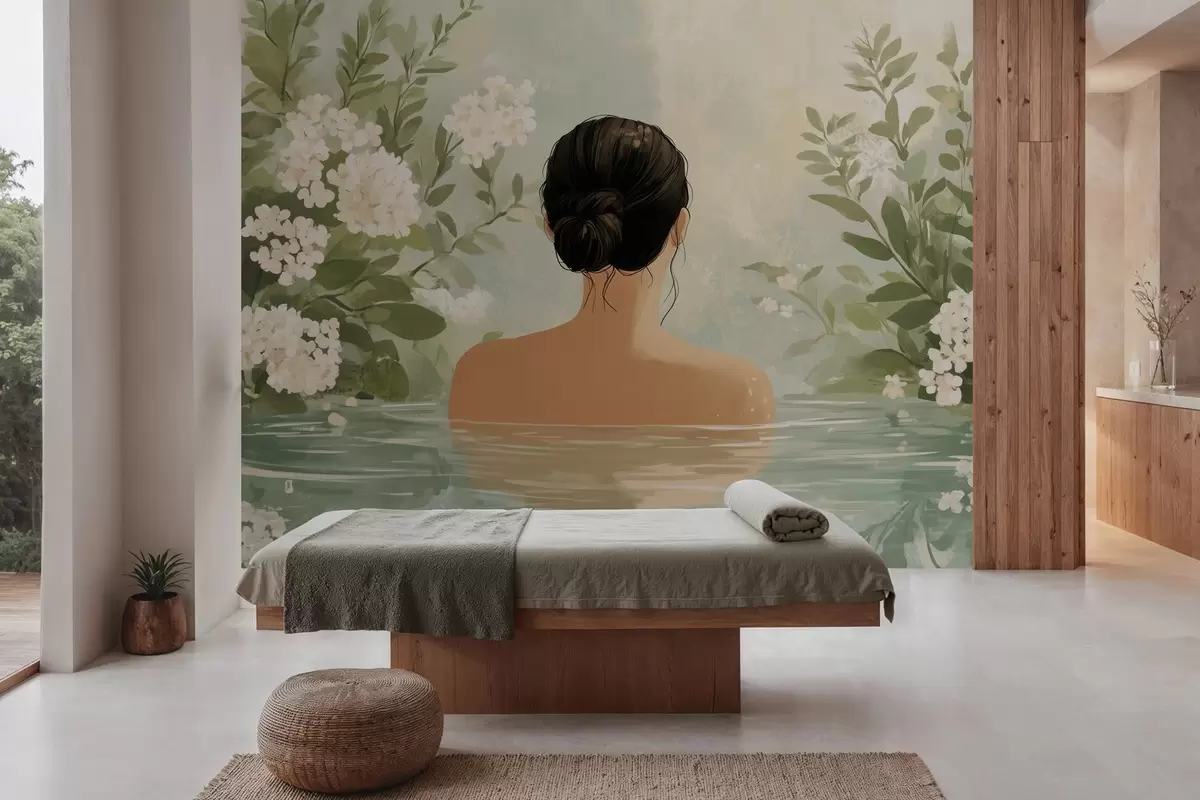 Fotobehang een serene en dromerige botanische illustratie van een vrouw die baadt in een kalm, reflecterend waterlichaam, omringd door weelderig groen en delicate witte bloemen. N° w03014
