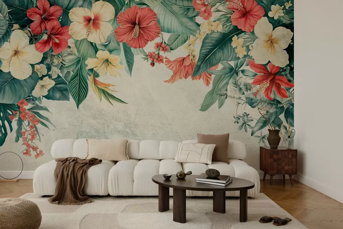 Fotobehang tropische bloemen en planten die van bovenaf op een getextureerde achtergrond hangen N° w03023