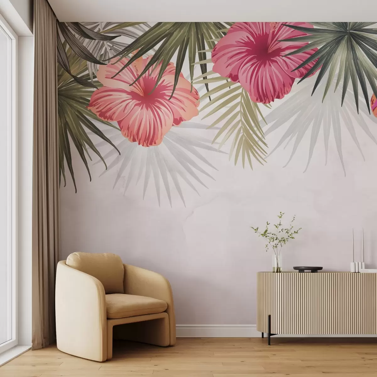Fotobehang Tropische bladeren en bloemen van bovenaf N° w03106