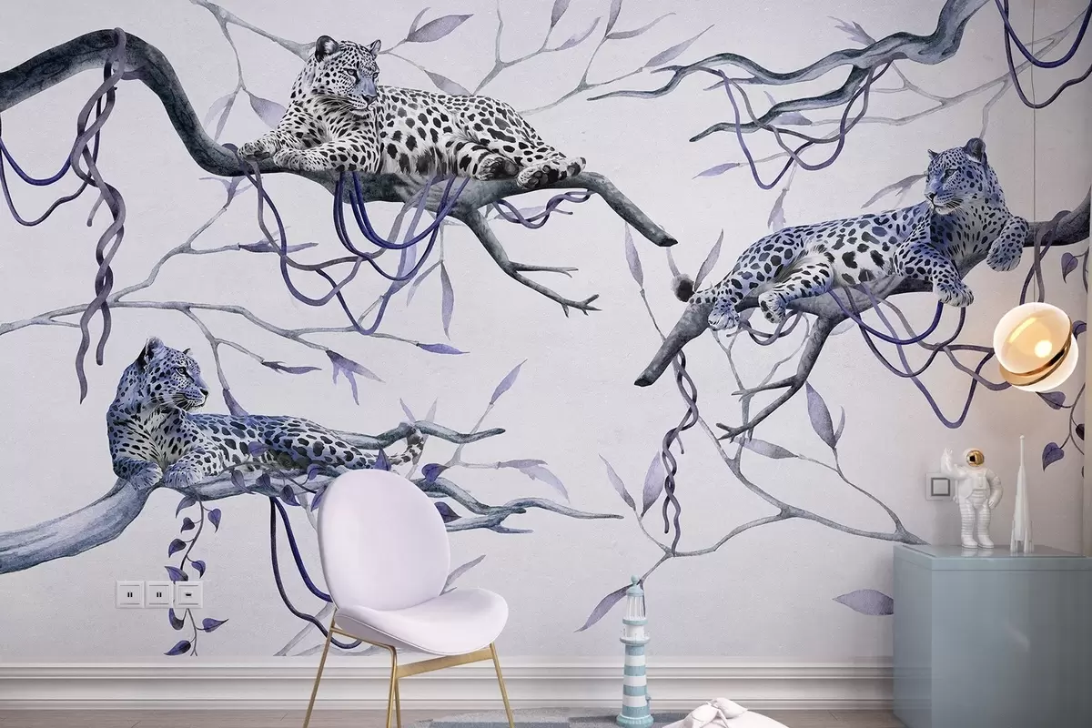 Fotobehang Luipaarden op de junglebomen, lianen, tropisch, wilde dieren, paars kleurenpalet N° w03146v3