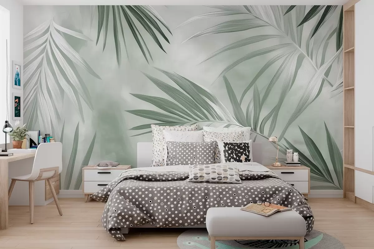 Fotobehang Tropische bladeren abstractie, palmboom, groen kleurenpalet N° w03153v2