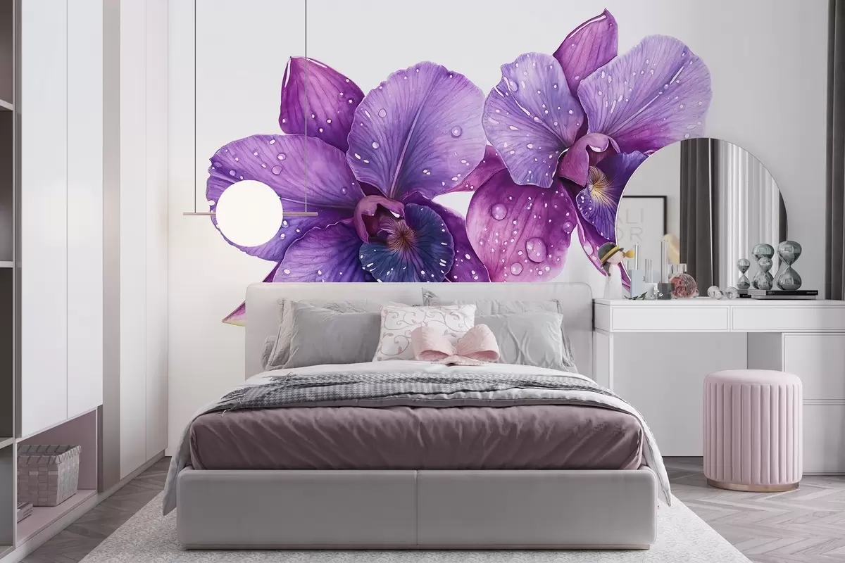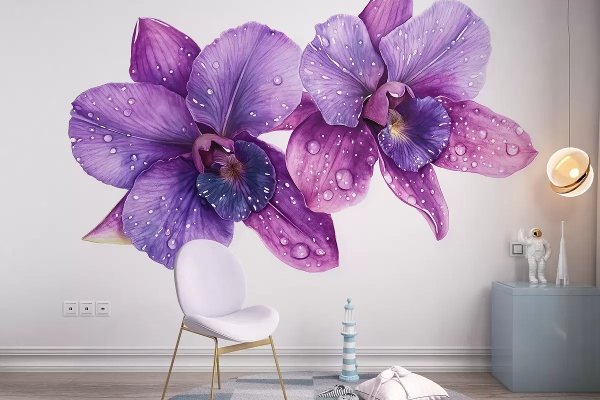 Fotobehang Prachtige orchidee bloemen, aquarel stijl tekening, paarse kleuren N° w03164