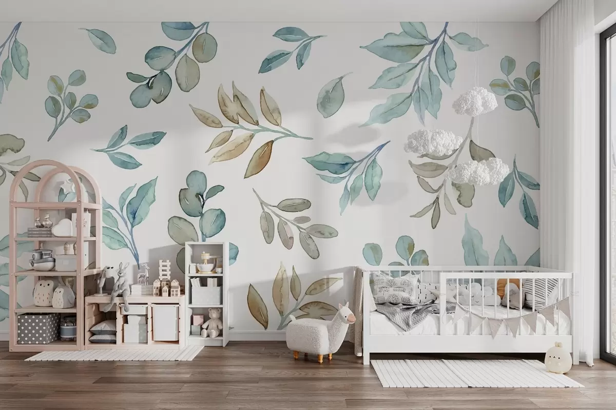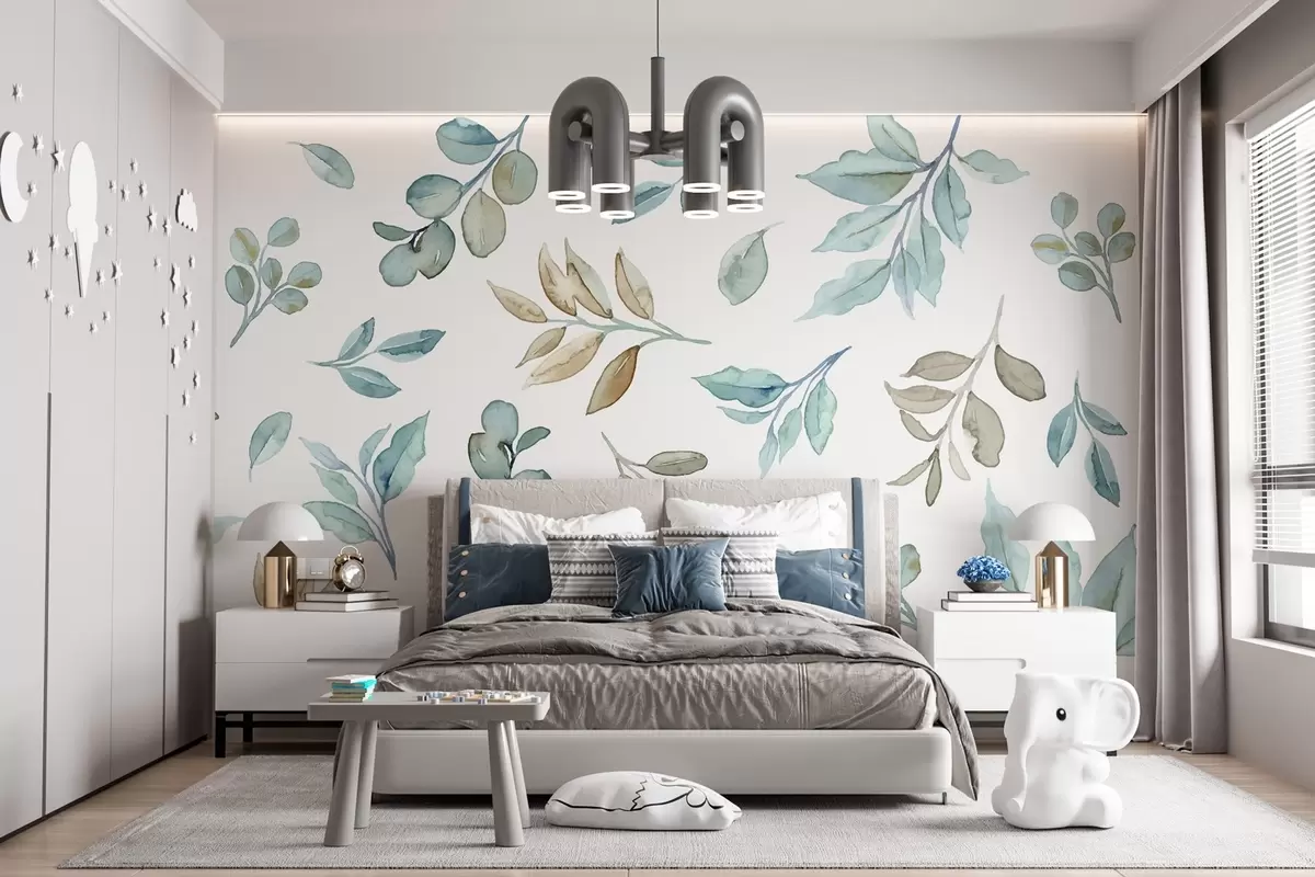 Fotobehang diverse bladeren en takken in aquareltechniek in blauwe en beige tinten op een witte achtergrond N° w03280