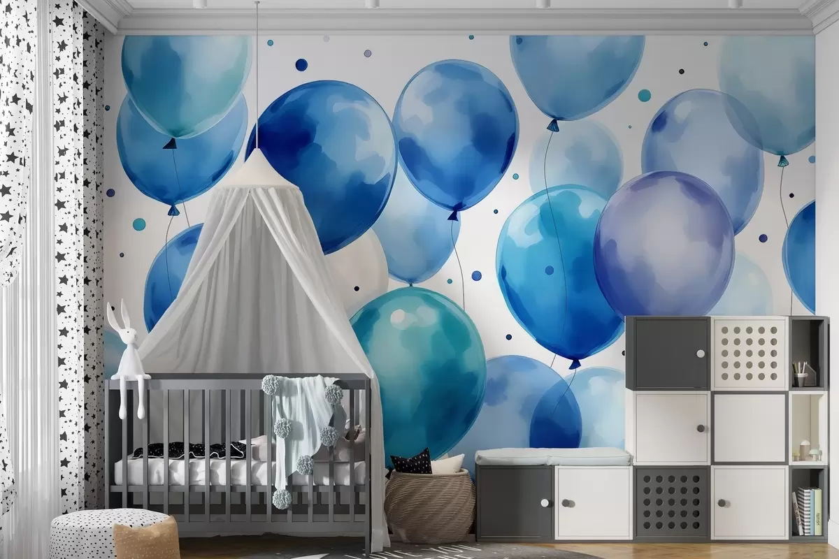 Fotobehang Blauwe luchtballonnen geschilderd met waterverf N° w03330