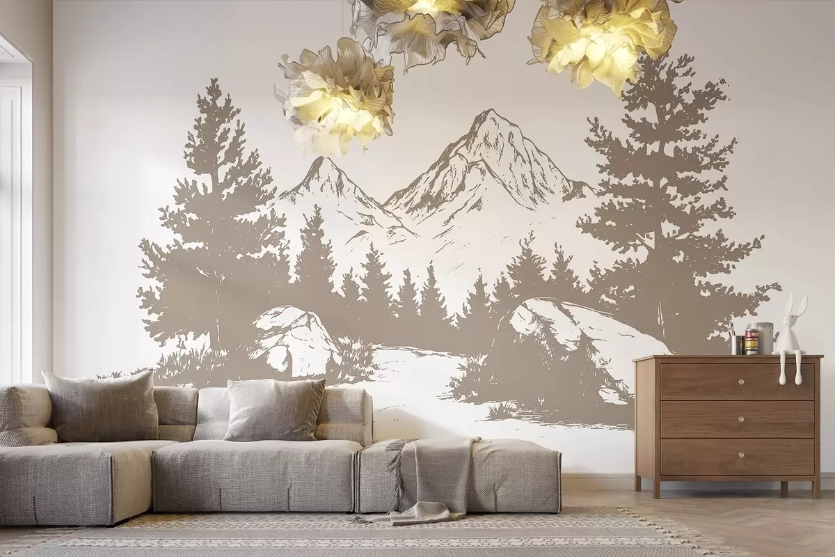 Fotobehang De Alpen, bergen met bos, lijntekening, beige kleur N° w03342