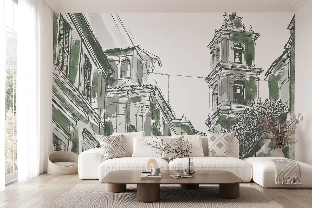 Fotobehang Mediterrane stadsstraat, kapel, architectuur, grijze en groene kleuren N° w03350v2