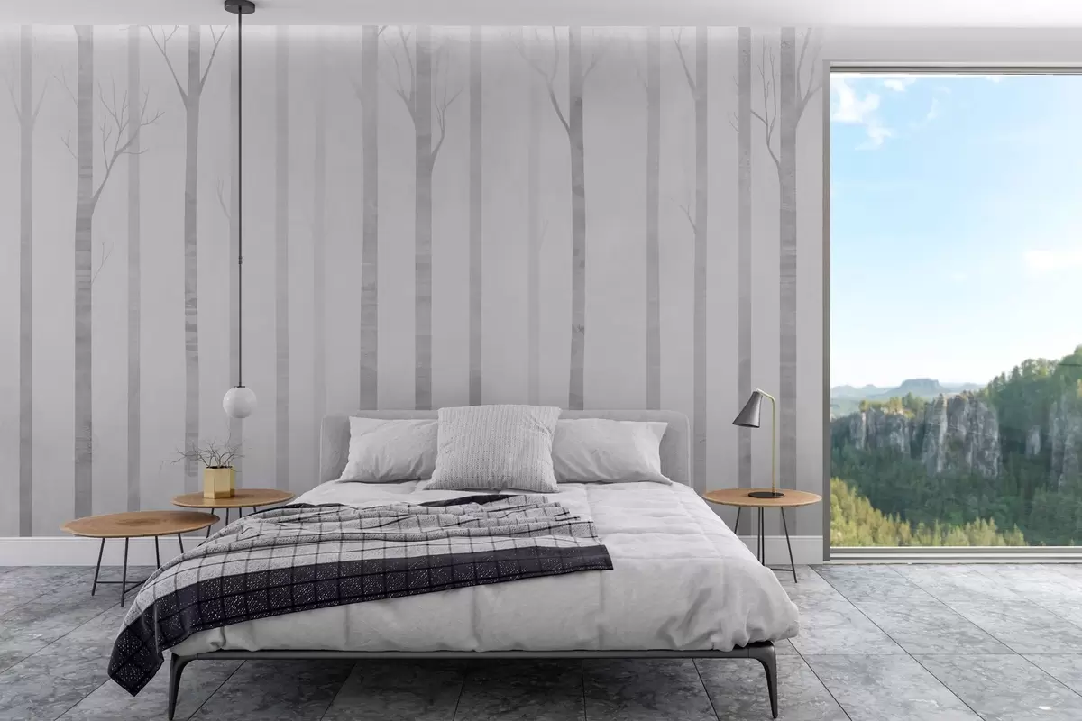 Fotobehang Boomstammen in de mist in grijstinten N° w03386