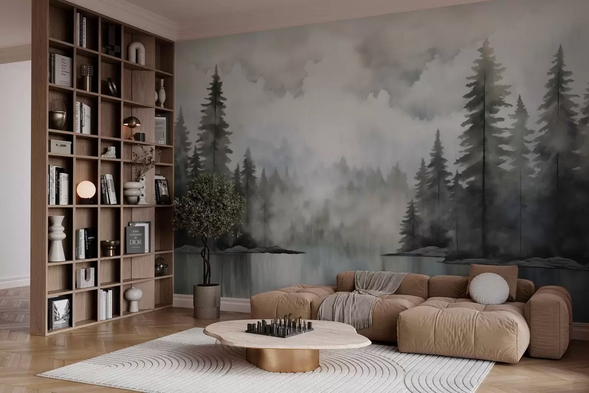 Fotobehang Bos, meer en bewolkte lucht in aquarelstijl N° w03387