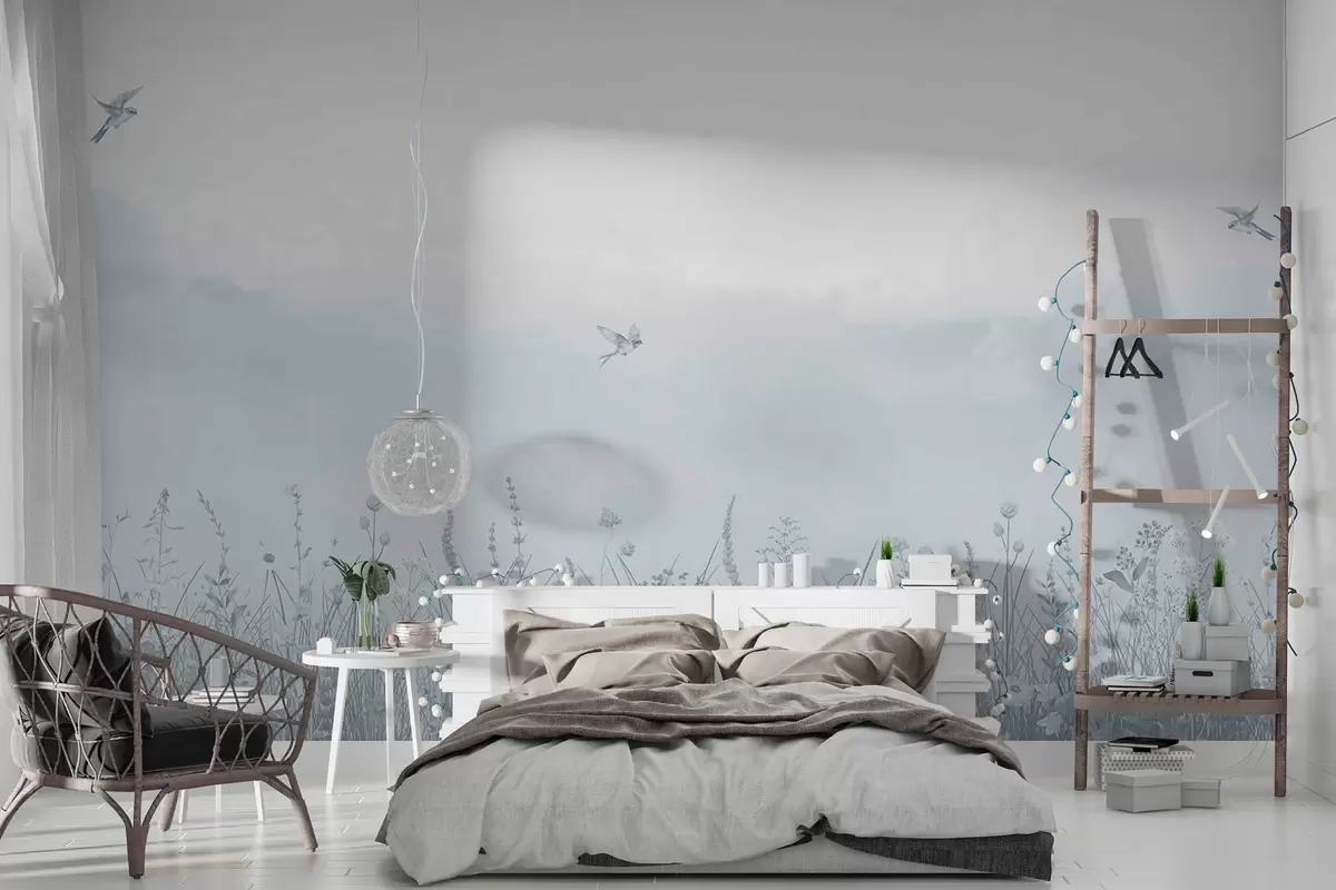 Fotobehang Wilde bloemen en wazige lucht in blauwe tinten N° w03391v1