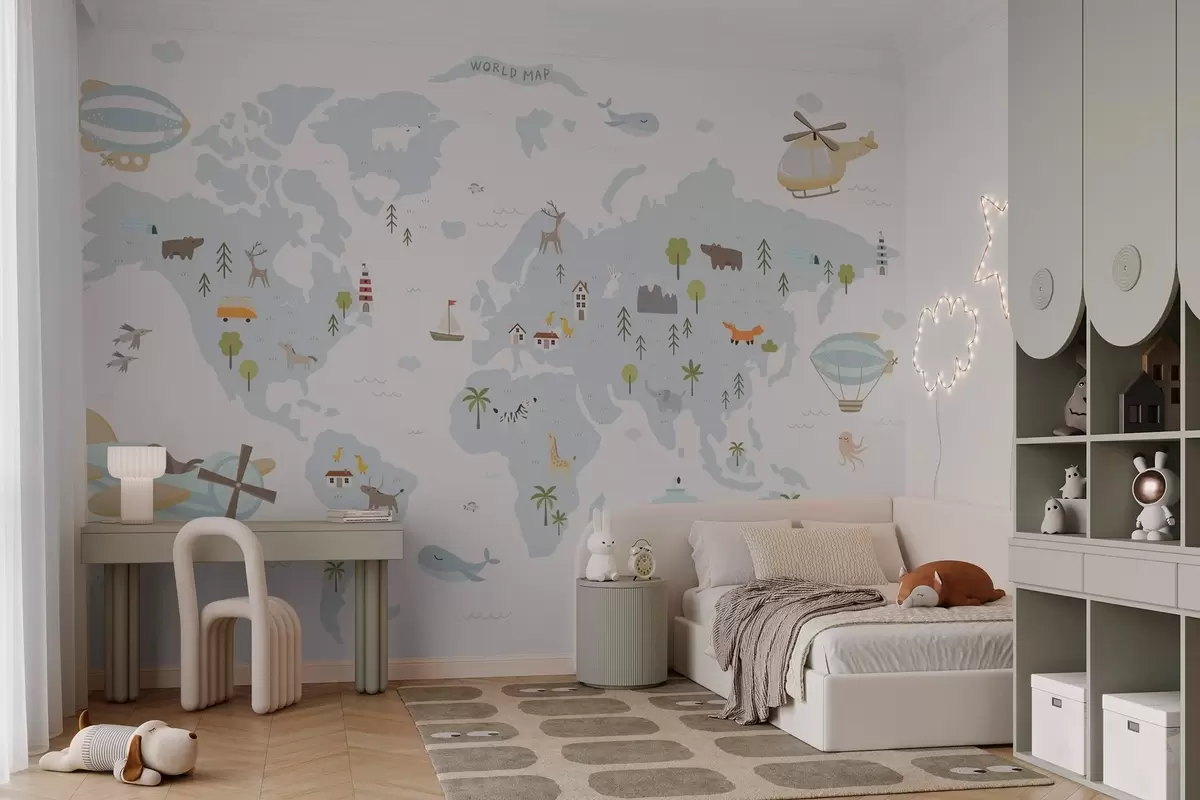 Fotobehang Wereldkaart voor kinderen met dieren en vliegtuigen N° w03392