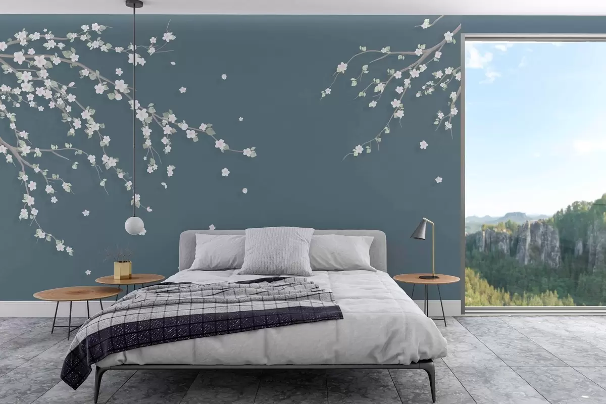 Fotobehang Bloeiende tak op de achtergrond van een muur in blauwe grunge stijl N° w03393v1