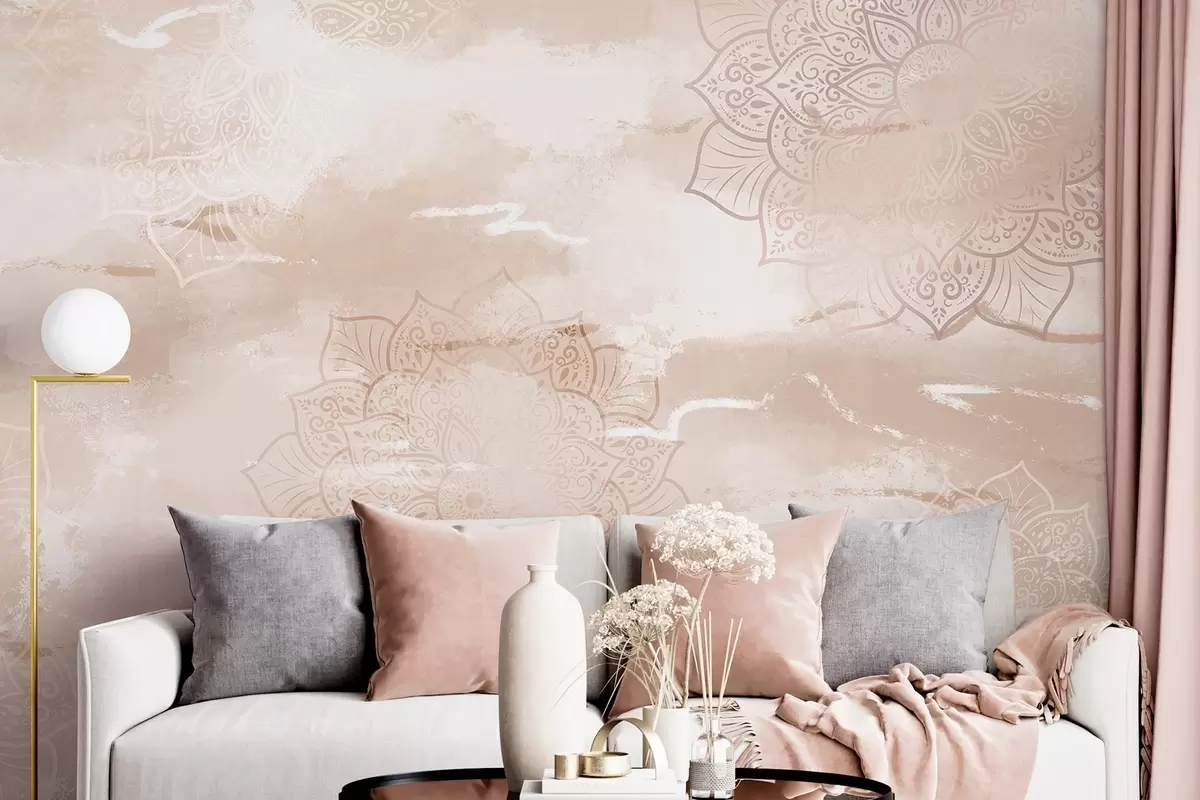 Fotobehang Mandala's op pastelkleurige achtergrond, levendige penseelstreken, beige kleuren N° w03409