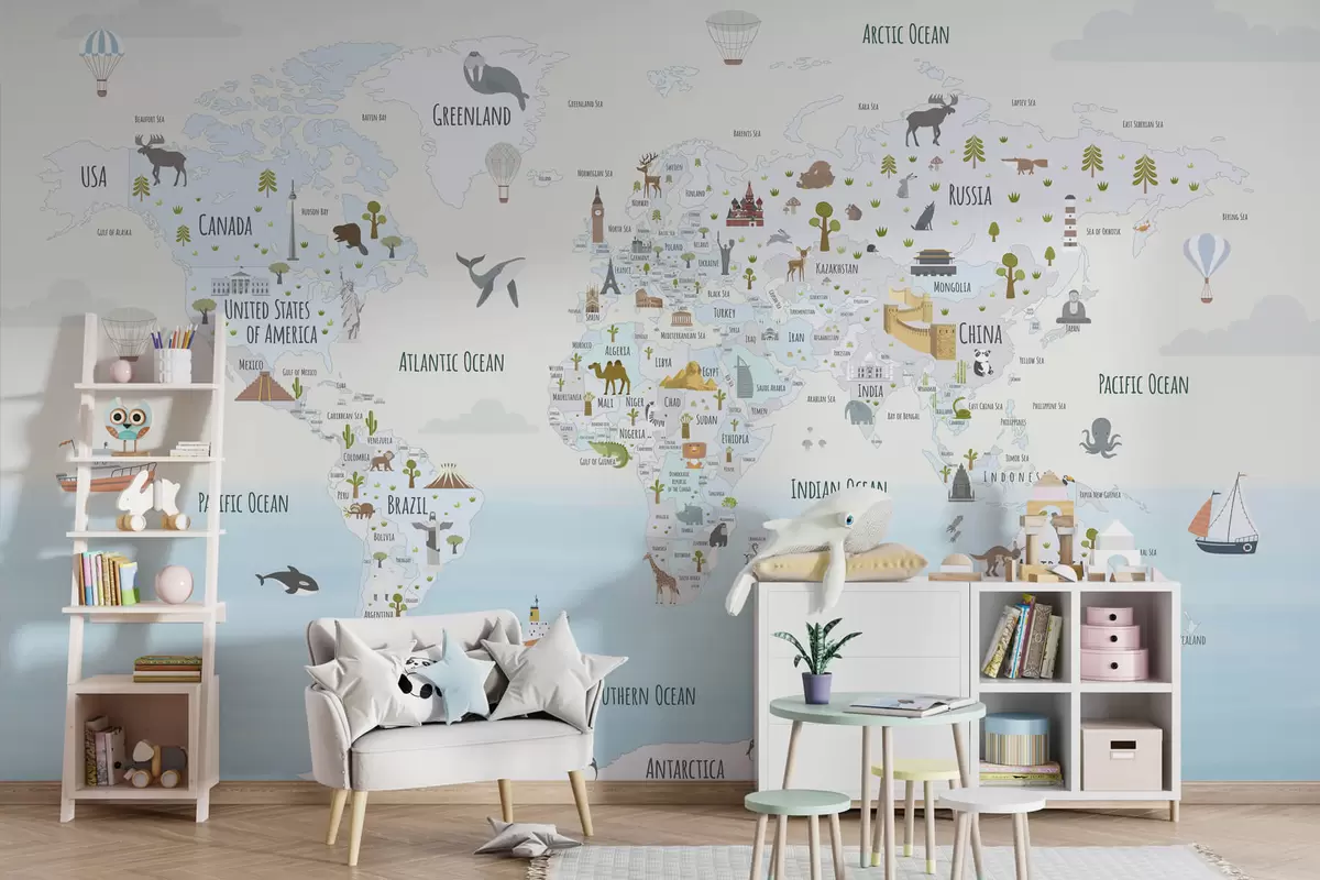 Fotobehang Wereldkaart met dieren en oriëntatiepunten N° w03410