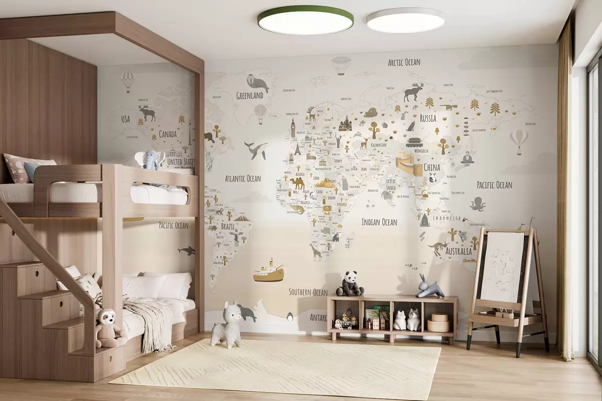 Fotobehang Wereldkaart met dieren en oriëntatiepunten N° w03410v1