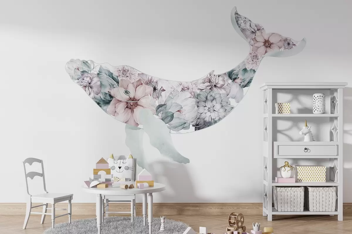 Fotobehang Prachtige walvis met aquarelbloemen, zeedieren N° w03445v1