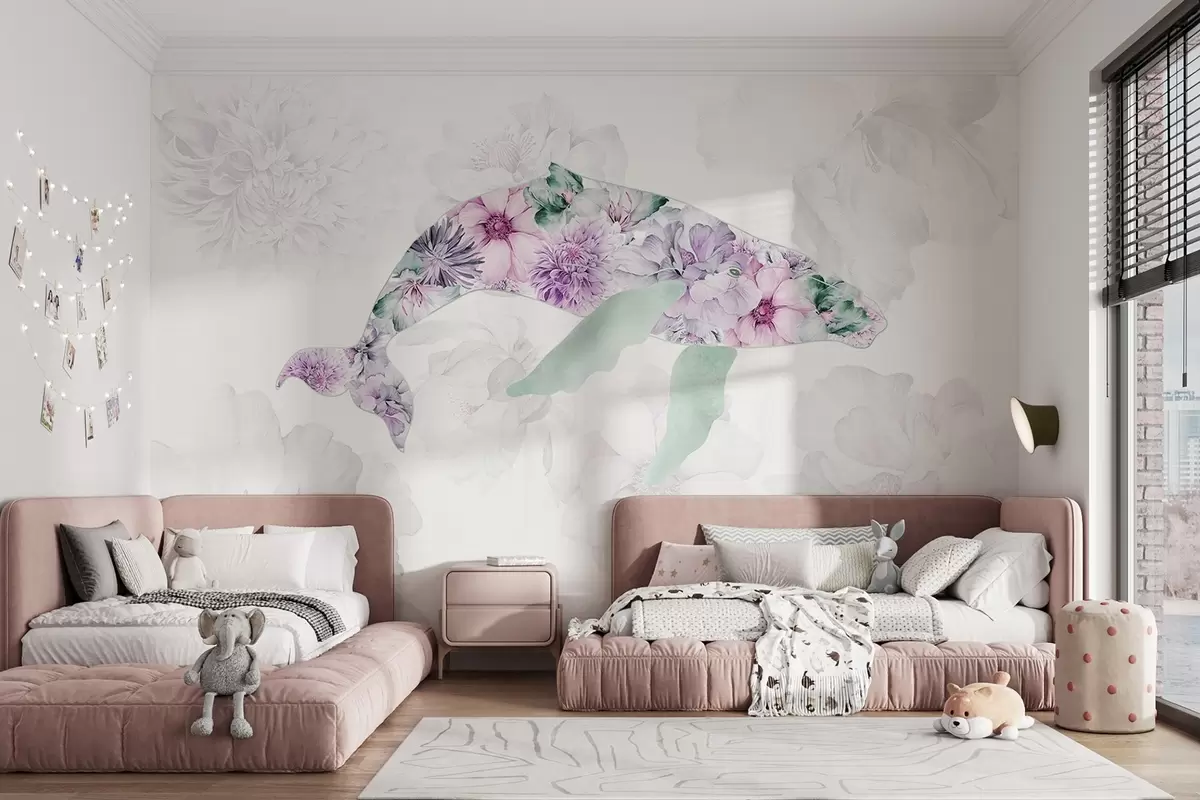Fotobehang Walvis met aquarel bloemen, oceaan dieren, minimalisme, roze en groen N° w03446v1