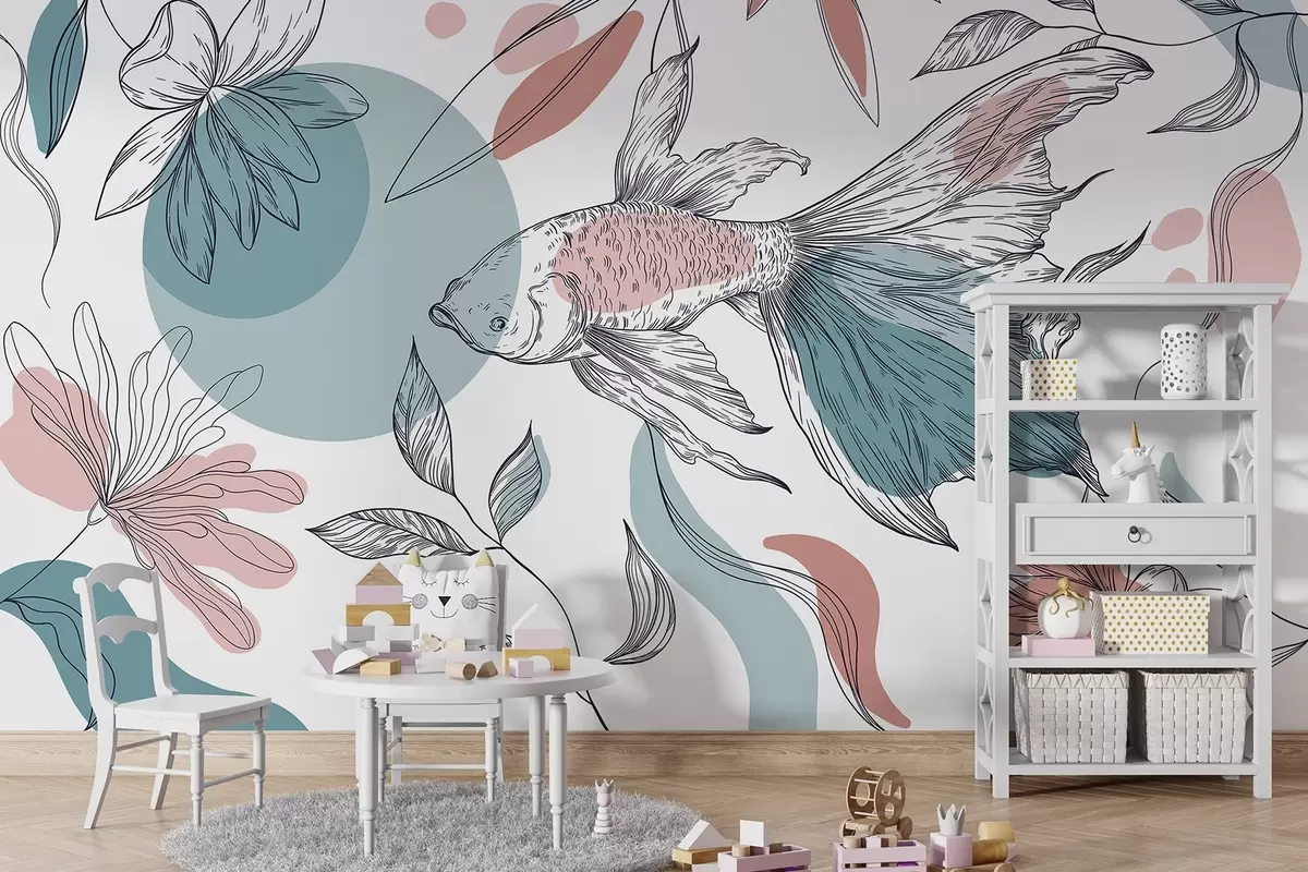 Fotobehang Lijntekening vis met bloemen, minimalisme, marine, bloemen, blauw en roze N° w03448v1
