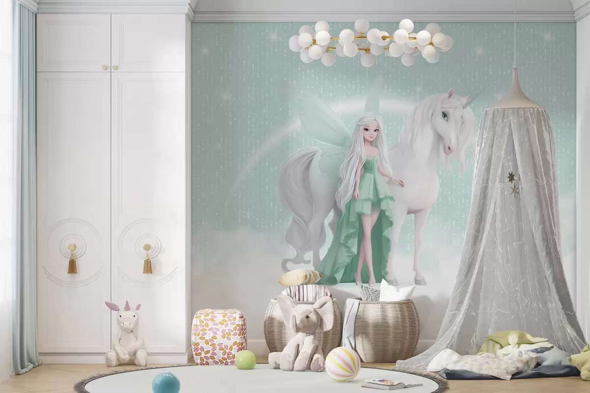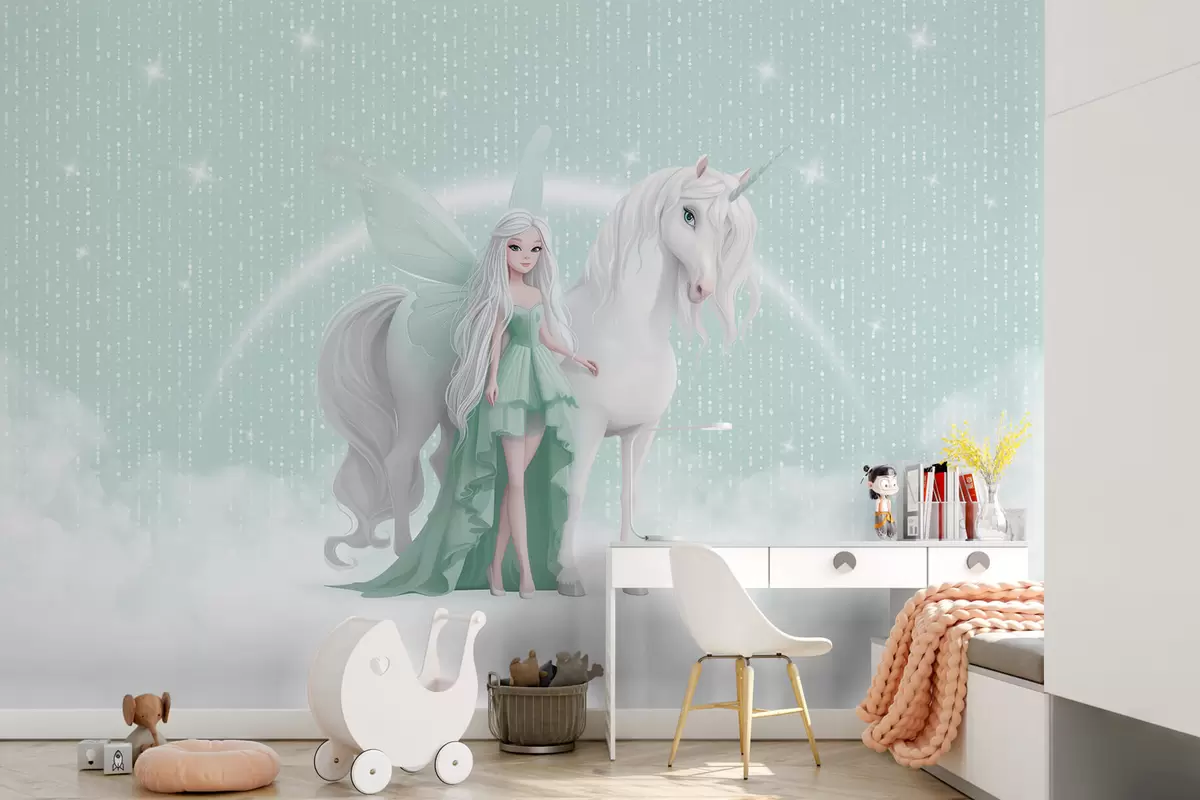 Fotobehang Een fee met een eenhoorn tussen de wolken N° w03527v2
