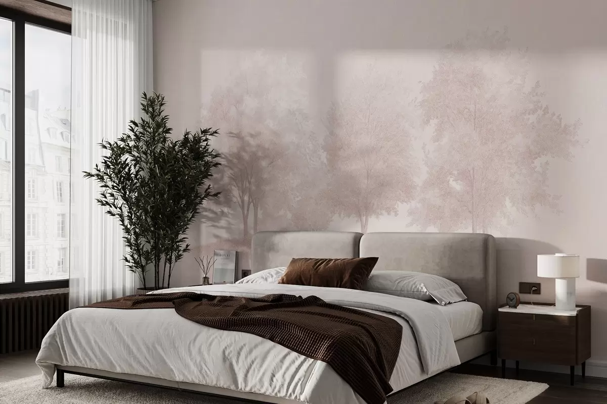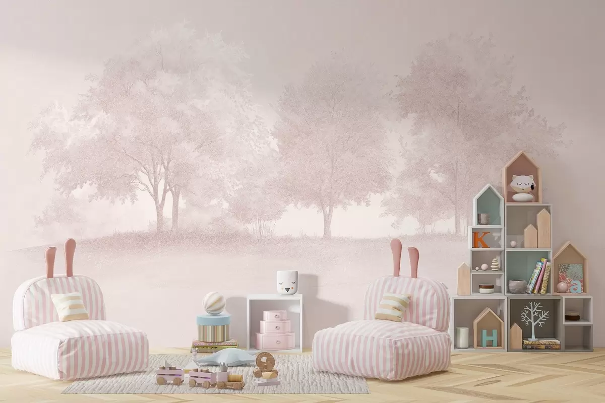 Fotobehang Bloesembomen, lente, potlood tekening, roze kleuren, natuur N° w03549