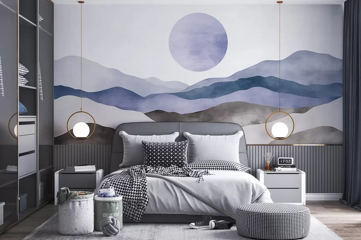 Fotobehang Aquarel bergen met de zon, boho stijl, paars, blauw, grijs N° w03551v1