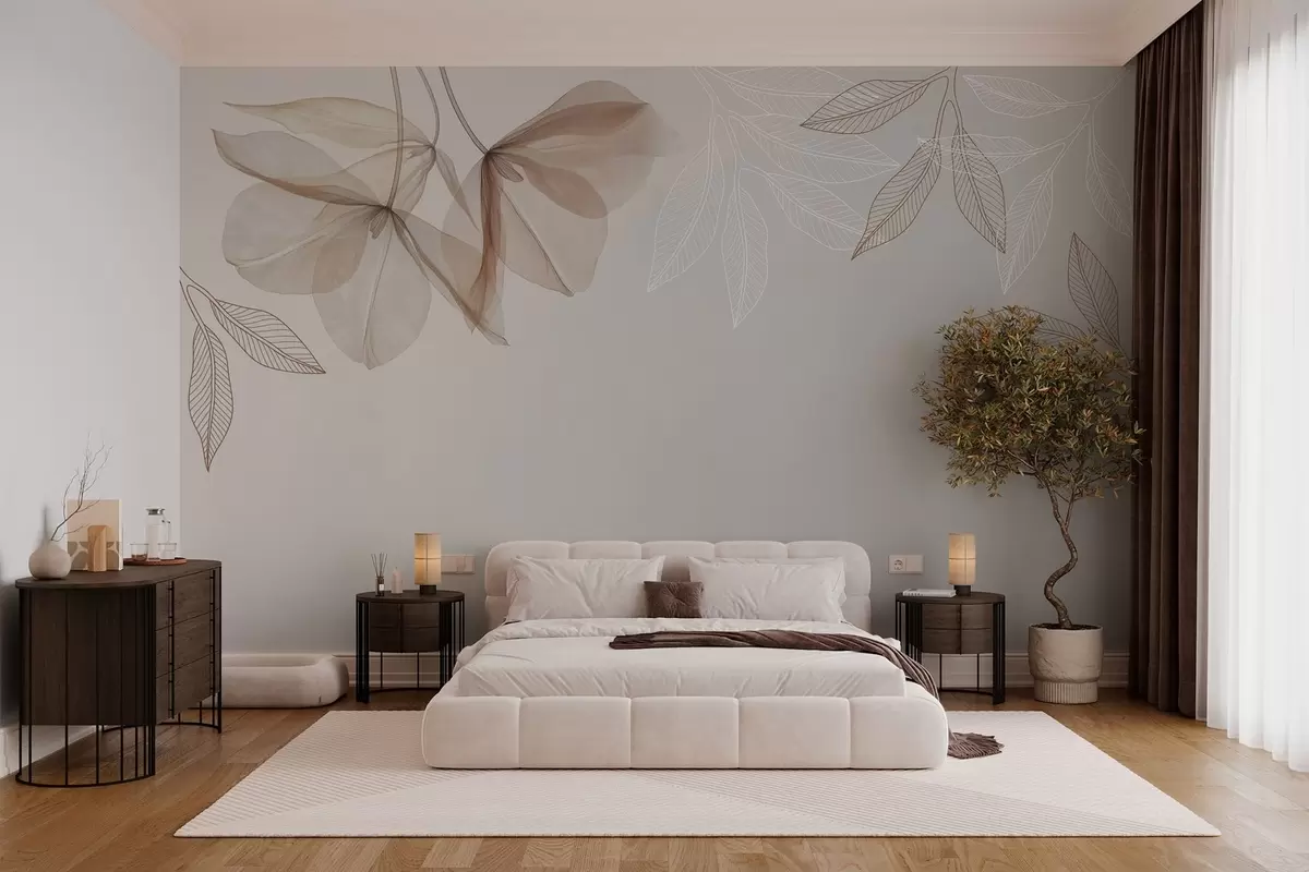 Fotobehang delicate doorschijnende bloemen en bladeren in mokkatinten N° w03616v3