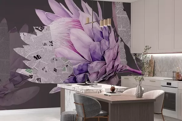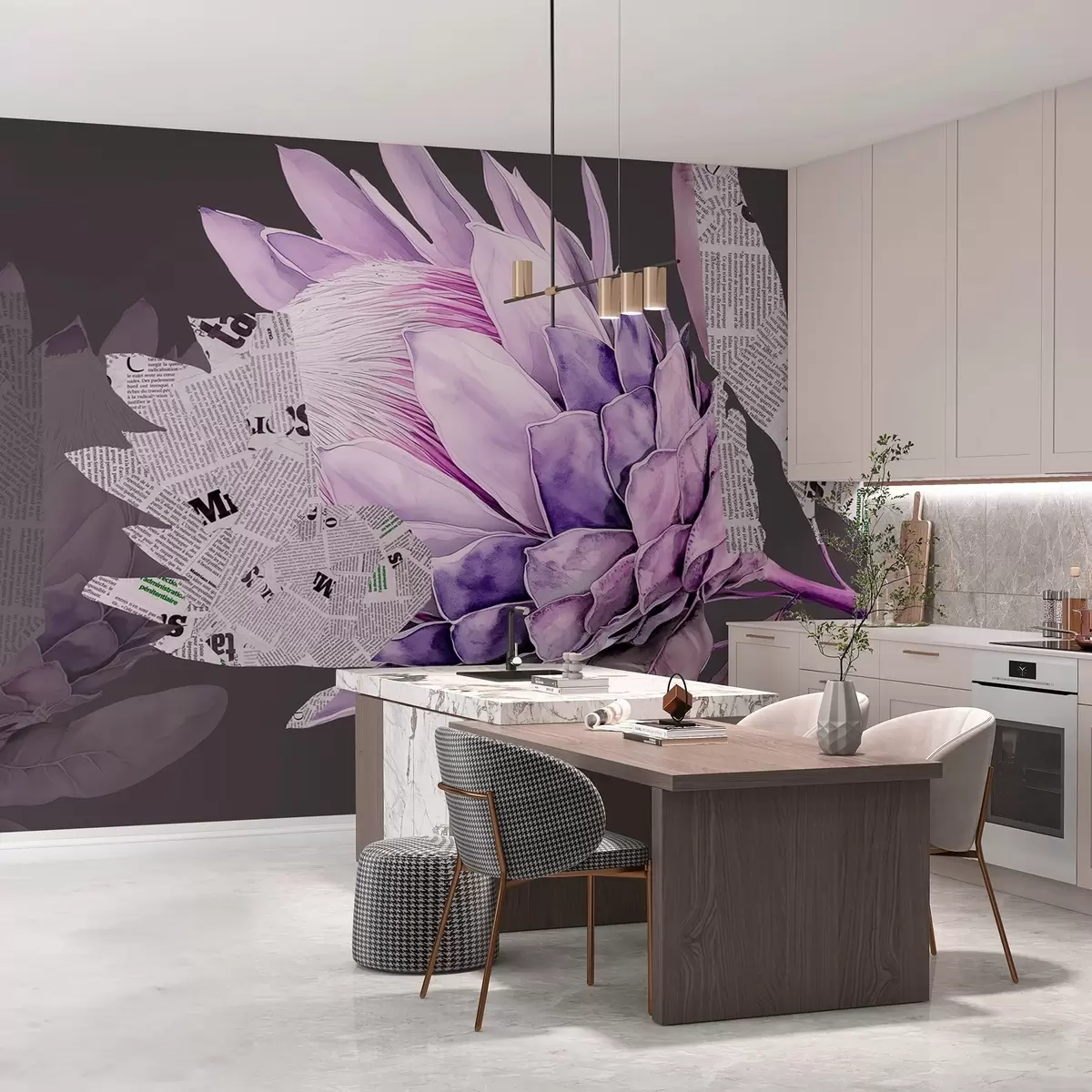 Fotobehang Protea bloemen, krantenkunst, bloemig, tropisch, donkere achtergrond, paarse kleuren N° w03667v2
