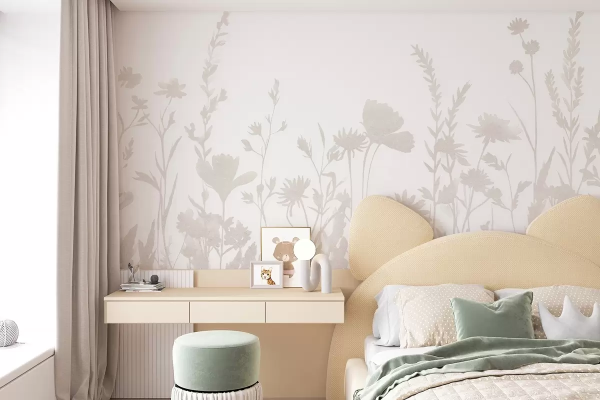 Fotobehang Zomerse weide, rustiek, bloemen, beige kleurenpalet N° w03670