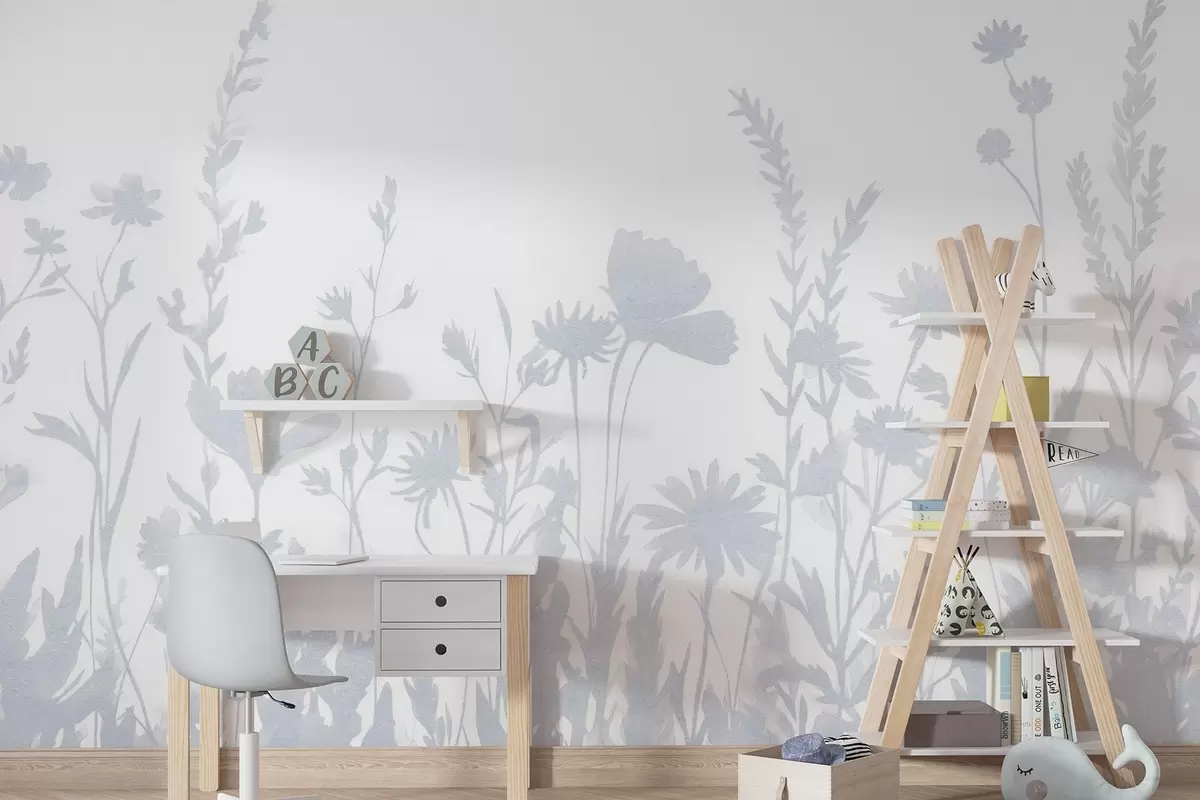 Fotobehang Zomerse weide, rustiek, bloemen, blauw kleurenpalet N° w03670v1