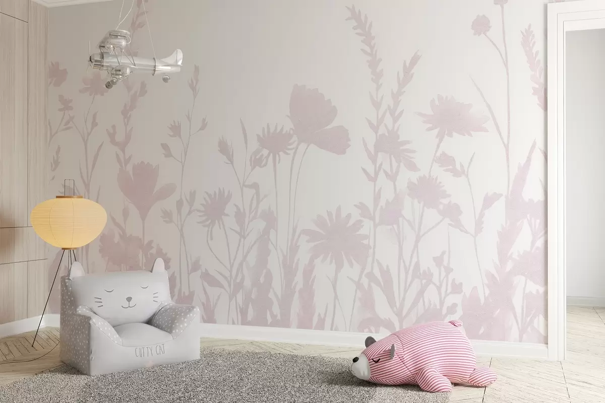 Fotobehang Zomerweide, rustiek, bloemen, roze kleurenpalet N° w03670v2