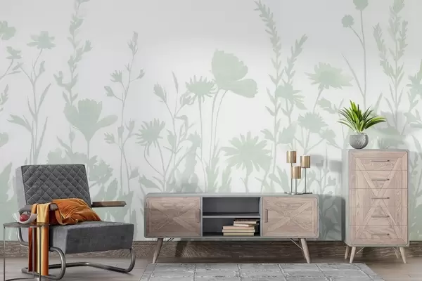 Fotobehang Zomerweide, rustiek, bloemen, groen kleurenpalet N° w03670v3