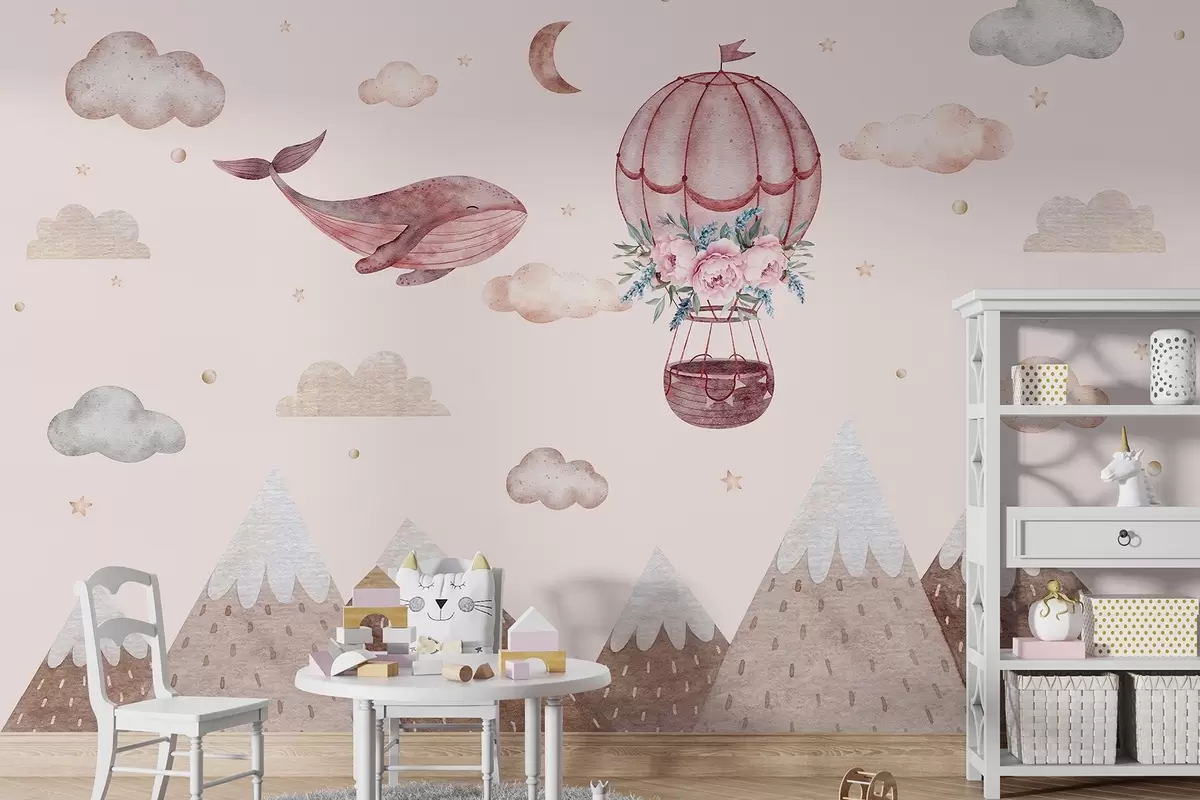 Fotobehang Leuke walvis met luchtballon, hemel met wolken, bergen, aquarelstijl, roze kleuren N° w03673