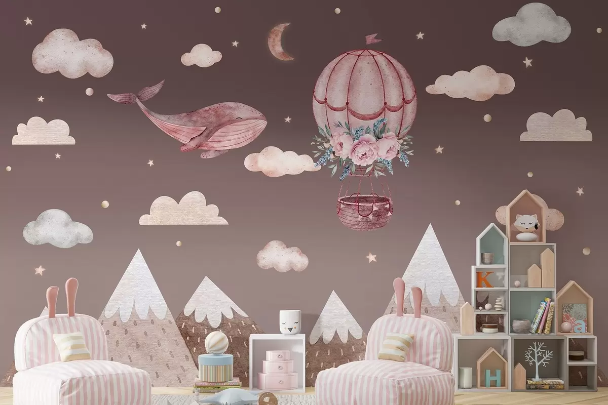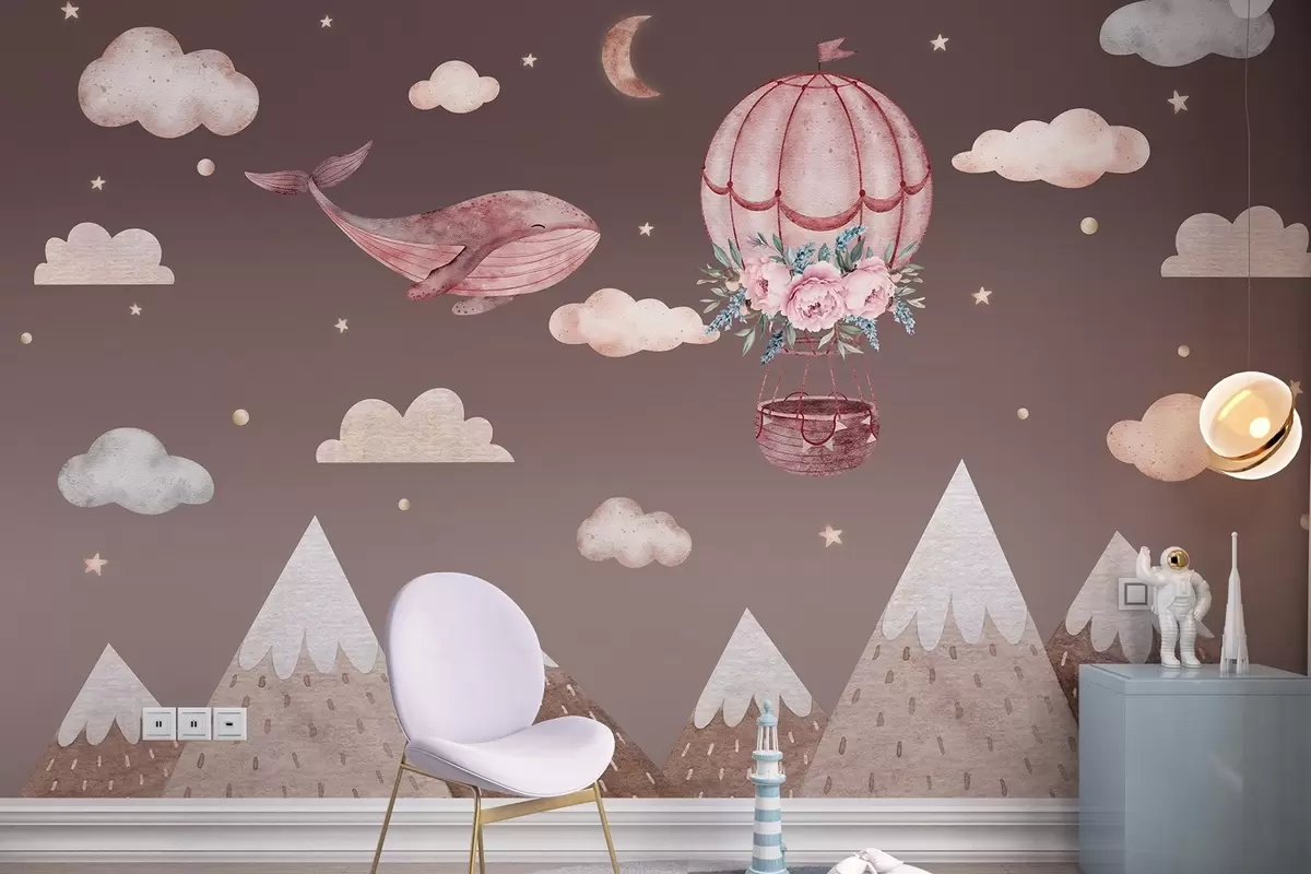 Fotobehang Leuke walvis met luchtballon, donkere lucht met wolken, bergen, aquarel, roze kleuren N° w03673v1
