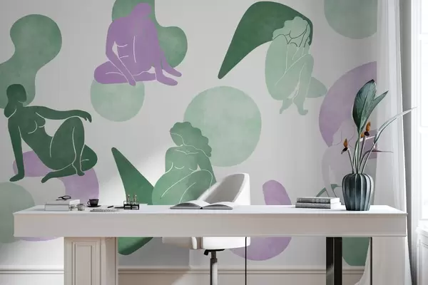 Fotobehang Geometrische abstracties met vrouwelijke silhouetten, boho-stijl, paars, groen N° w03753v4
