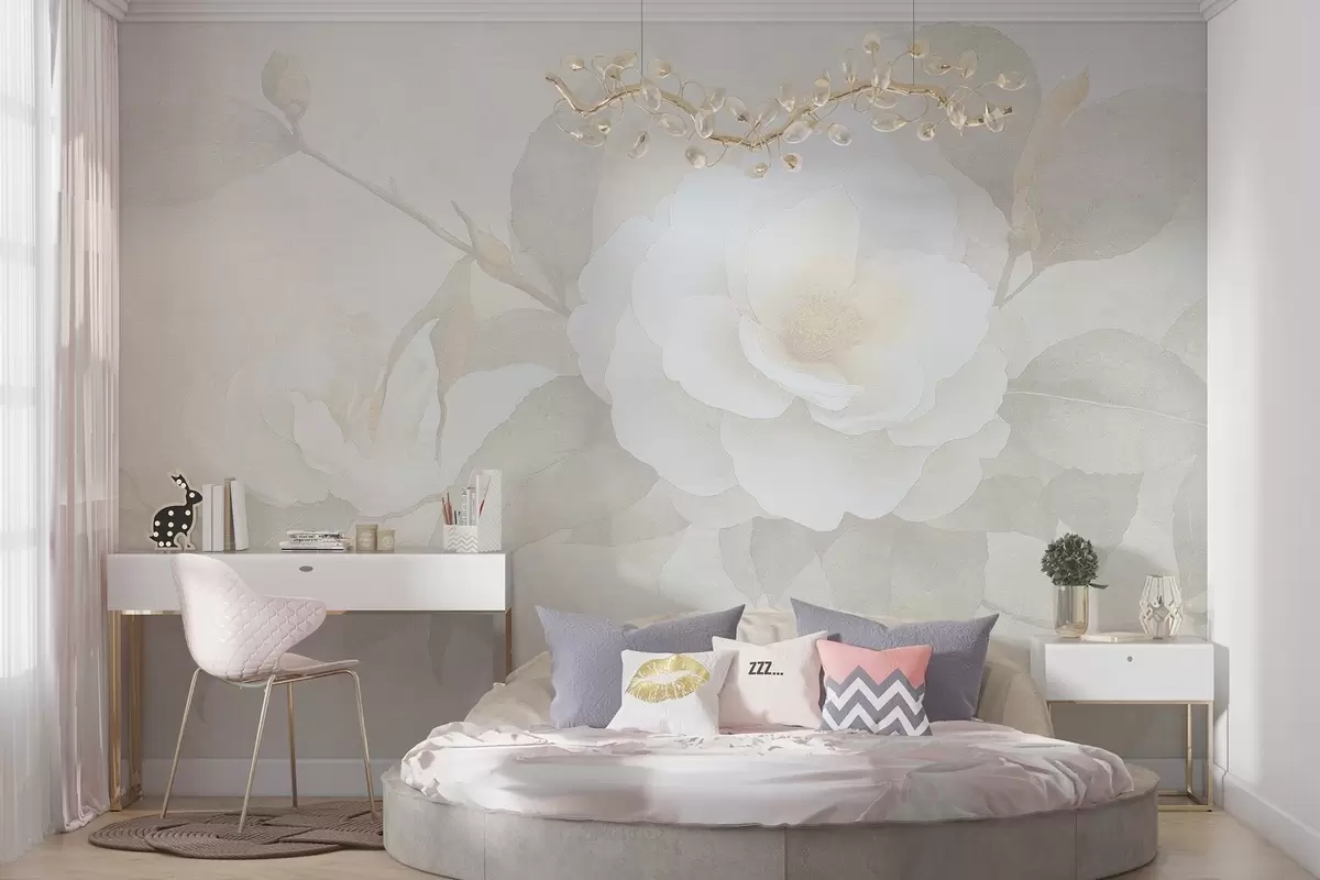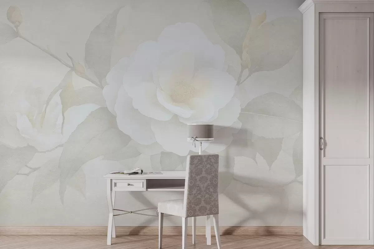 Fotobehang Zacht pastel met camelia bloemen op de tak, beige kleuren N° w03760