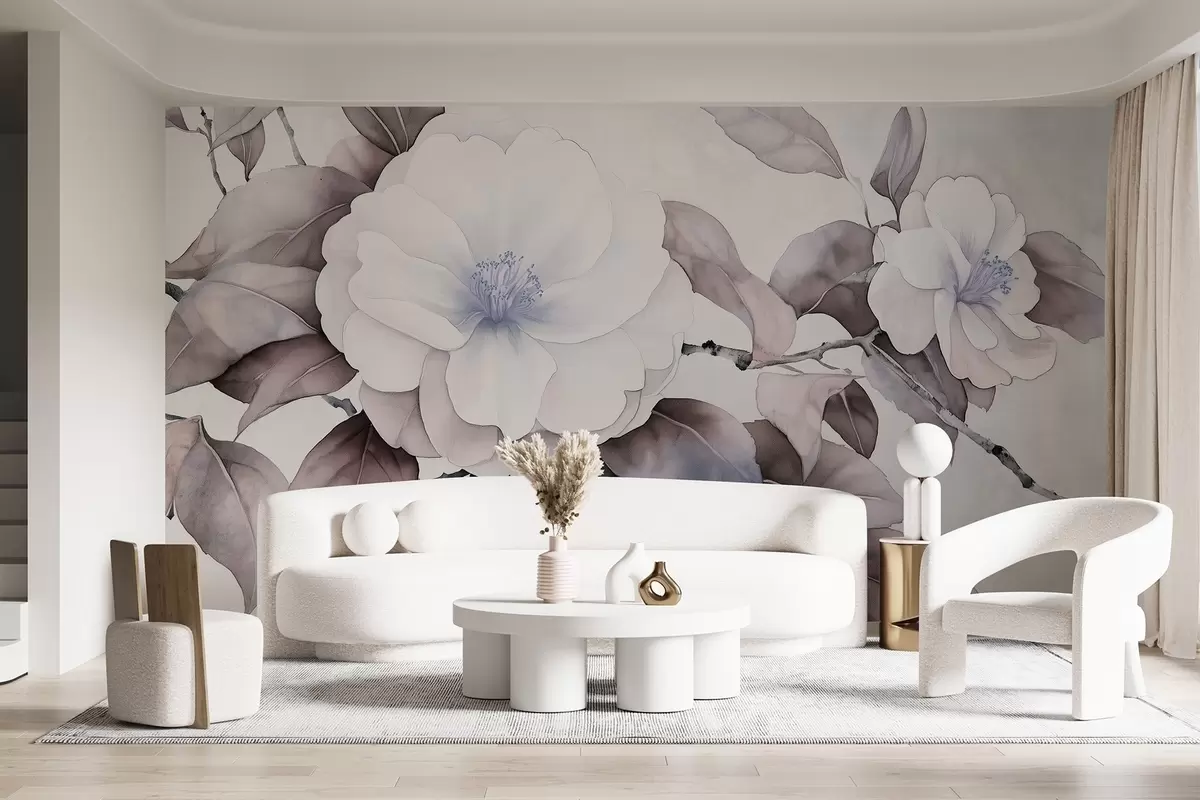 Fotobehang Aquarel stijl camelia bloemen op de tak, paarse kleuren N° w03761v1
