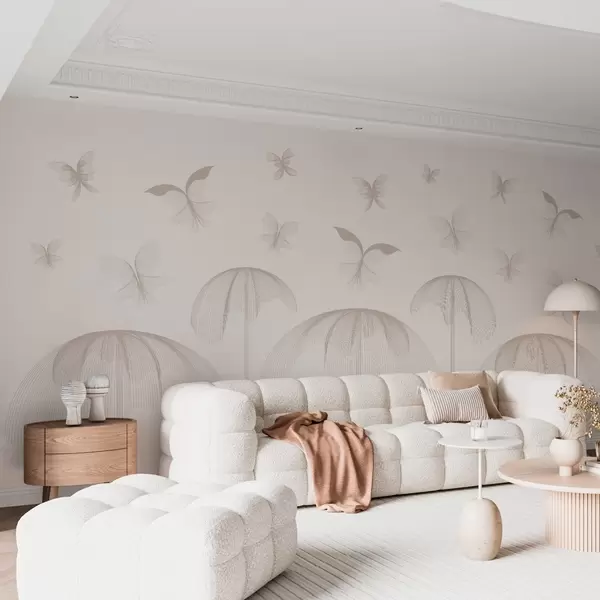 Fotobehang minimalistisch lineair behang vlinders en fonteinen op een melkachtige achtergrond N° w03762