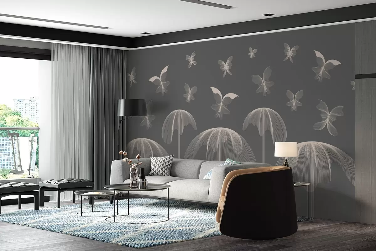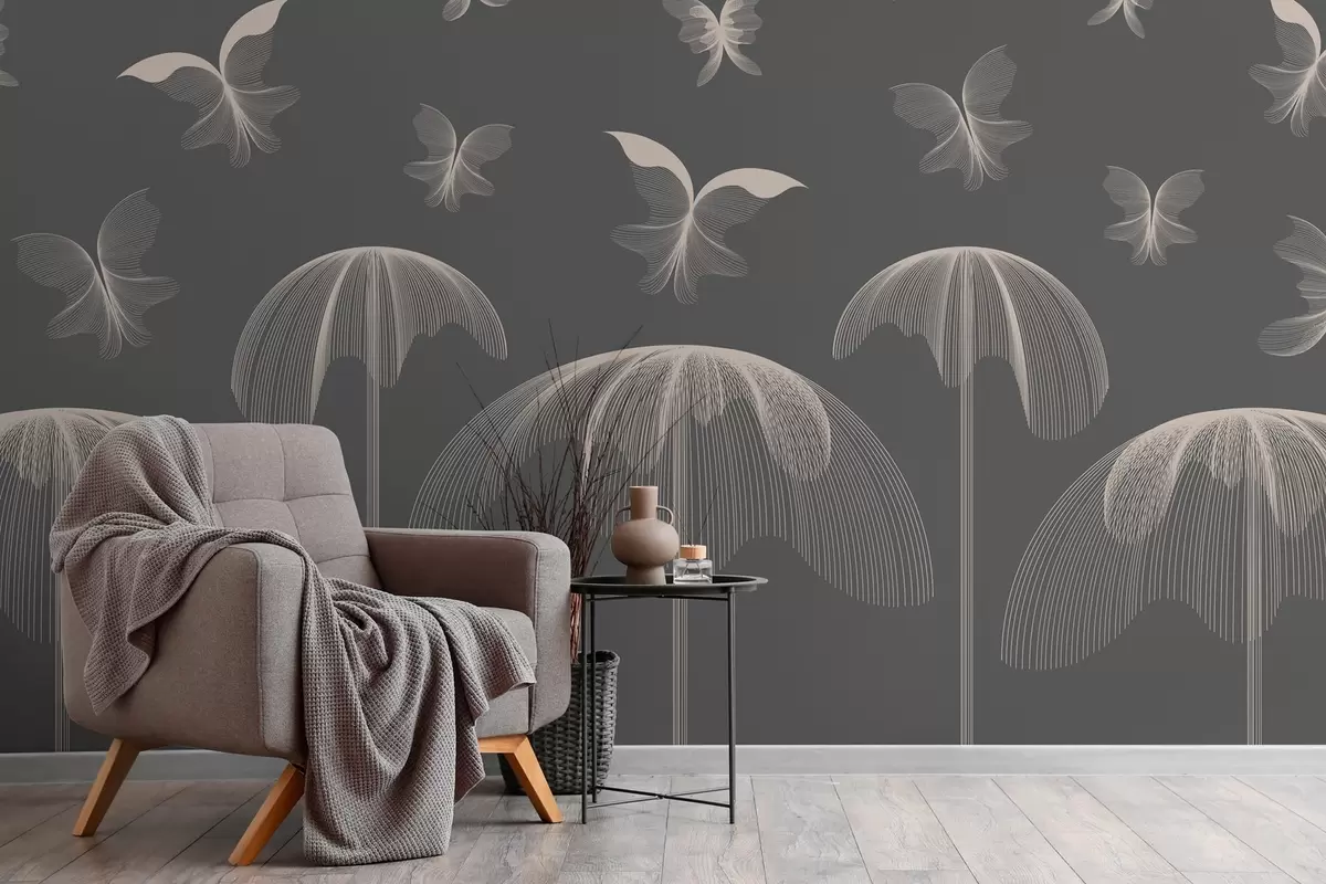 Fotobehang minimalistisch lineair behang vlinders en fonteinen op donkergrijze achtergrond N° w03762v1