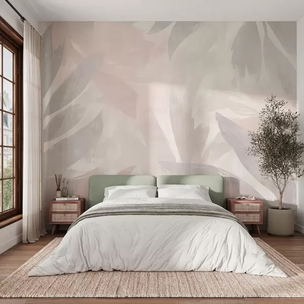 Fotobehang Tropische bladeren, bloemen, palmbomen, pastelstijl, roze en beige kleuren N° w03881