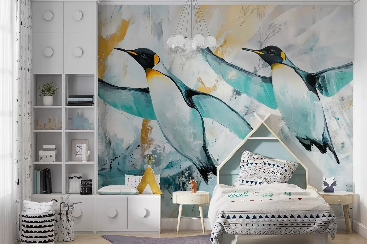 Fotobehang Schattige pinguïns, Antarctica, blauw ijs, dieren, olieverf tekening N° w03883