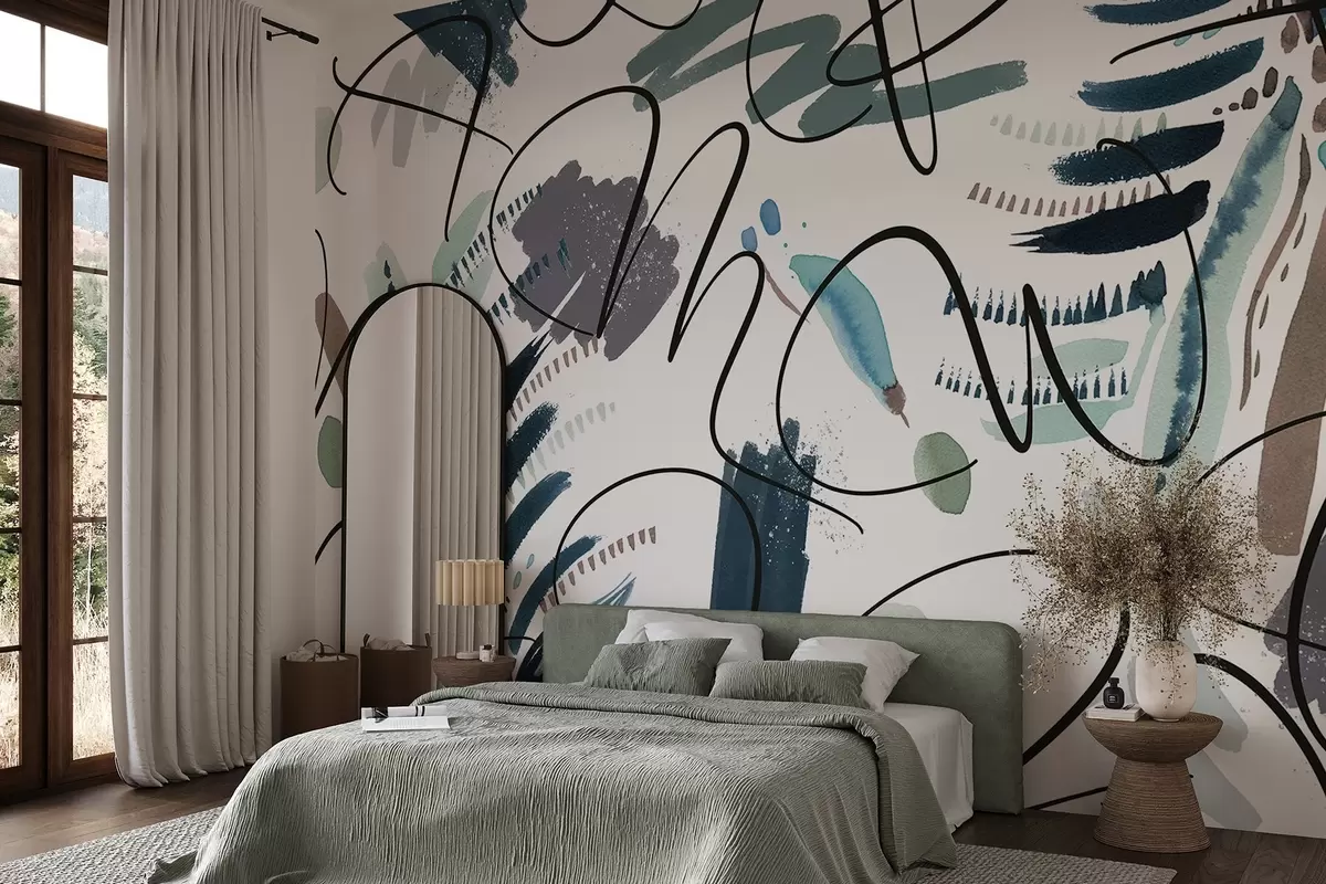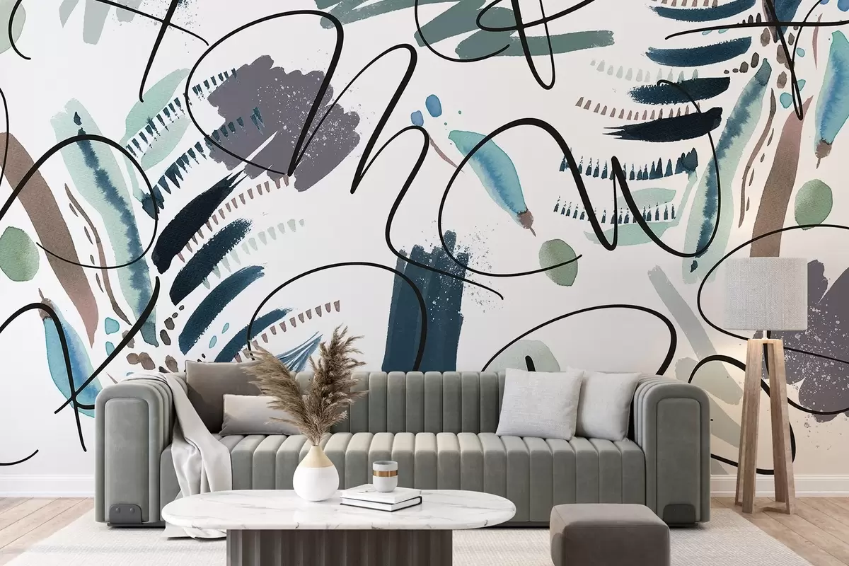 Fotobehang Inktletters, kalligrafie, penseelstreken, blauwe kleuren, abstractie N° w03912v2